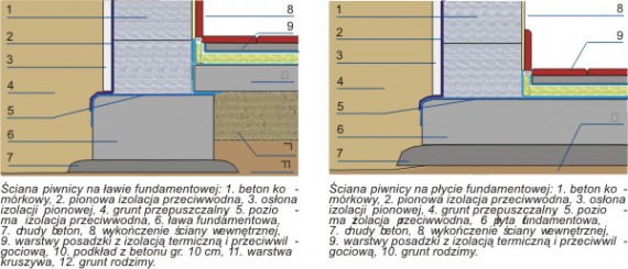 Z betonu komórkowego można budować ściany piwnic, jednak jednym z warunków jest wypełnienie spoin pionowych zaprawą. Zalecane jest używanie bloczków z gładkimi powierzchniami czołowymi. Oprócz bloczków, używa się płaskich belek nadprożowych oraz kształtek U. Elementy łączy się zaprawą cienkowarstwową lub tradycyjną. Ściany piwnic należy chronić przed działaniem wody i wilgoci z gruntu, stosując odpowiednią izolację, zależną od warunków gruntowo-wodnych, w miejscu budowy. Możliwe jest wykonanie izolacji typu lekkiego lub średniego, tzw. przeciwwilgociowej (budynek posadowiony powyżej zwierciadła wody gruntowej) oraz izolacji typu ciężkiego, tzw. przeciwwodnej (jeśli występuje ciśnienie hydrostatyczne). Sposób wykonania izolacji opisano w ulotkach pt. "Fundament dobrze zaizolowany" (Edycja2010-5) oraz "Izolacja ścian piwnic" (Edycja 2008).